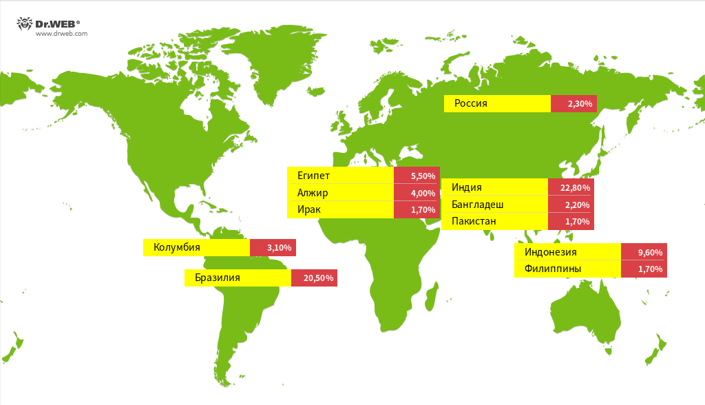 Страны с наибольшим числом устройств, зараженных Android.Backdoor.Baohuo.1.origin (по данным антивирусной лаборатории «Доктор Веб»)