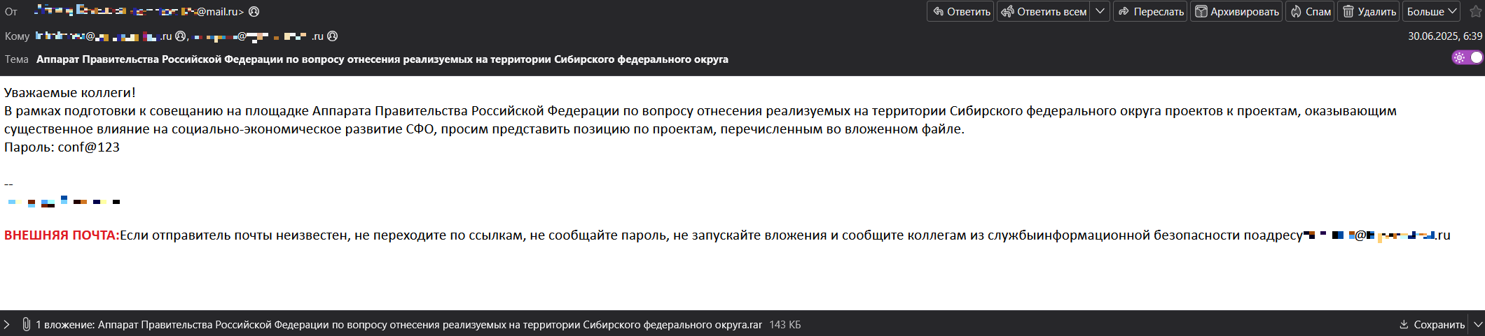 - для распространения первой ступени заражения проводят фишинговые рассылки якобы от имени государственных структур и используют для этого скомпрометированные email-адреса;